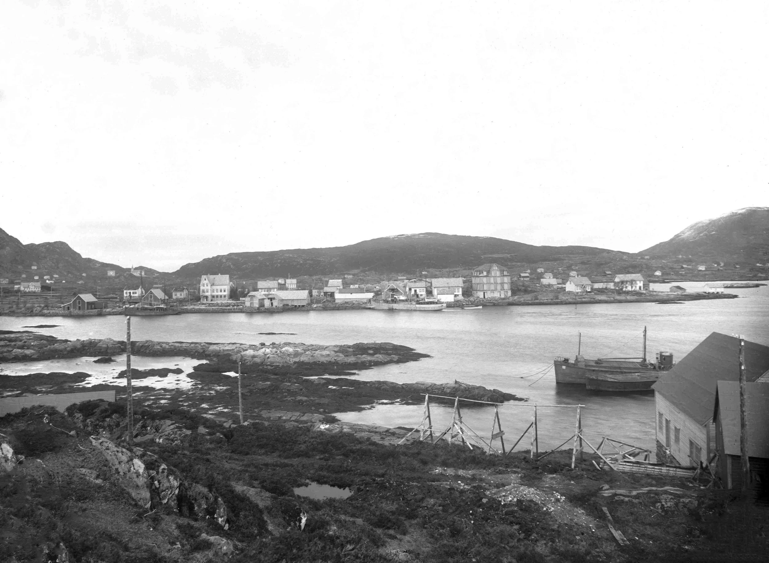Skotholmen med pakkhus, butikkbygning, røykeri og våningshus. Bilete er tatt midt på 1920-talet.