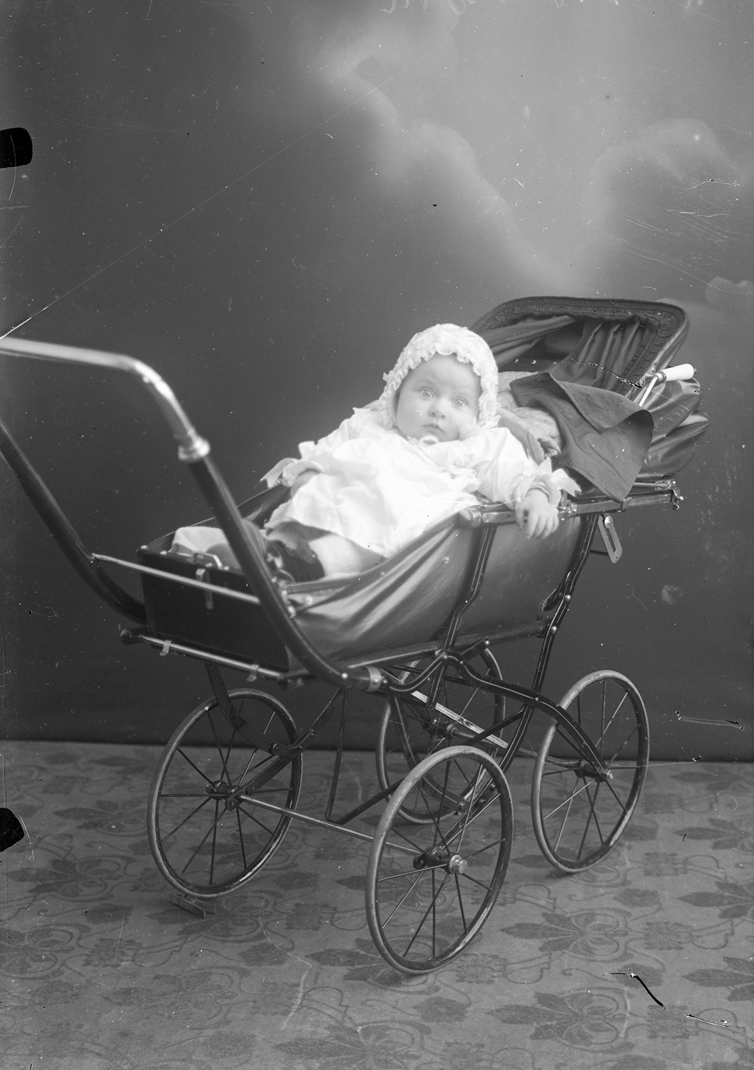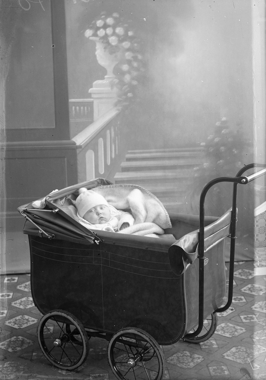 Barnevogn med ukjent baby, fotografert i atelieret i 1915.