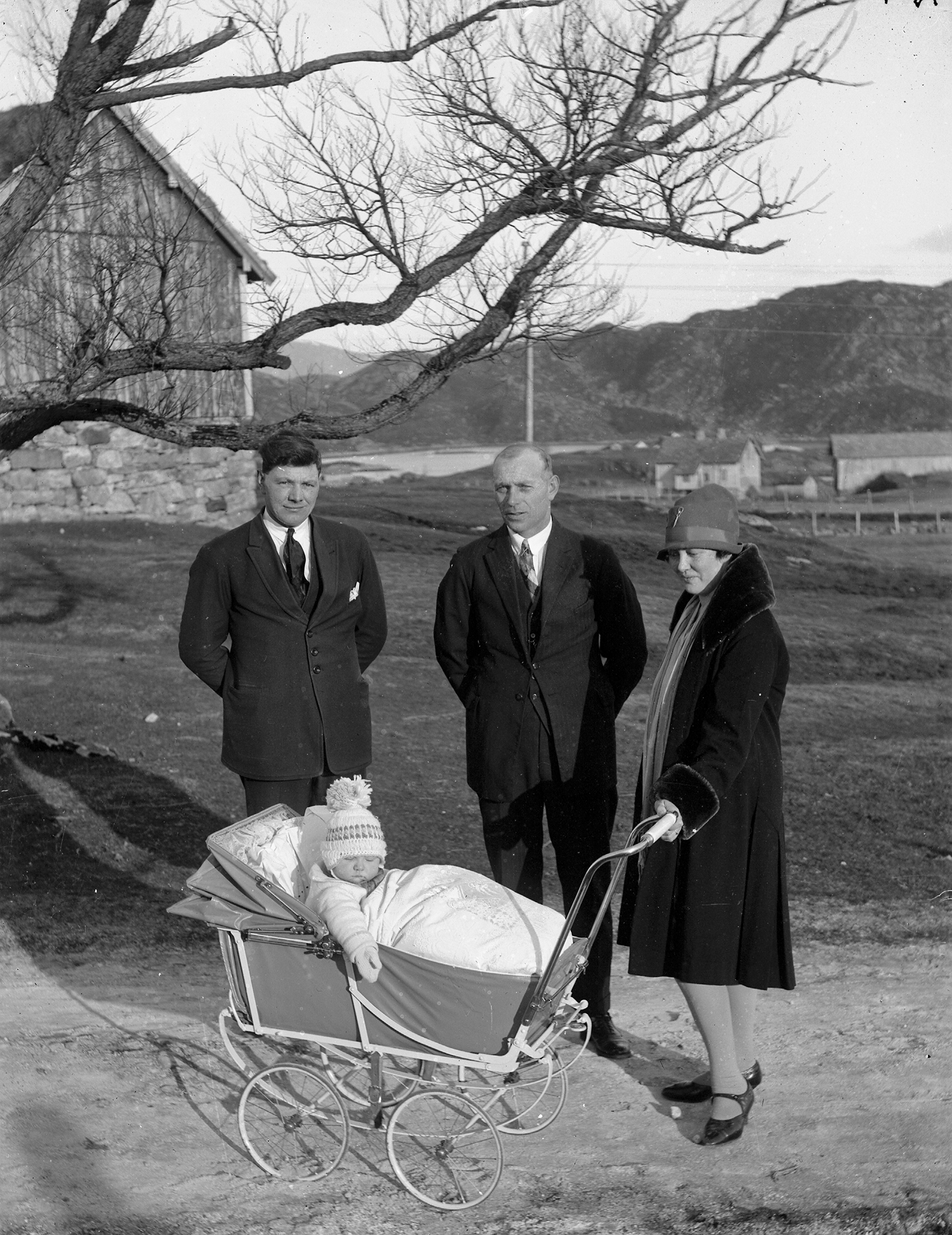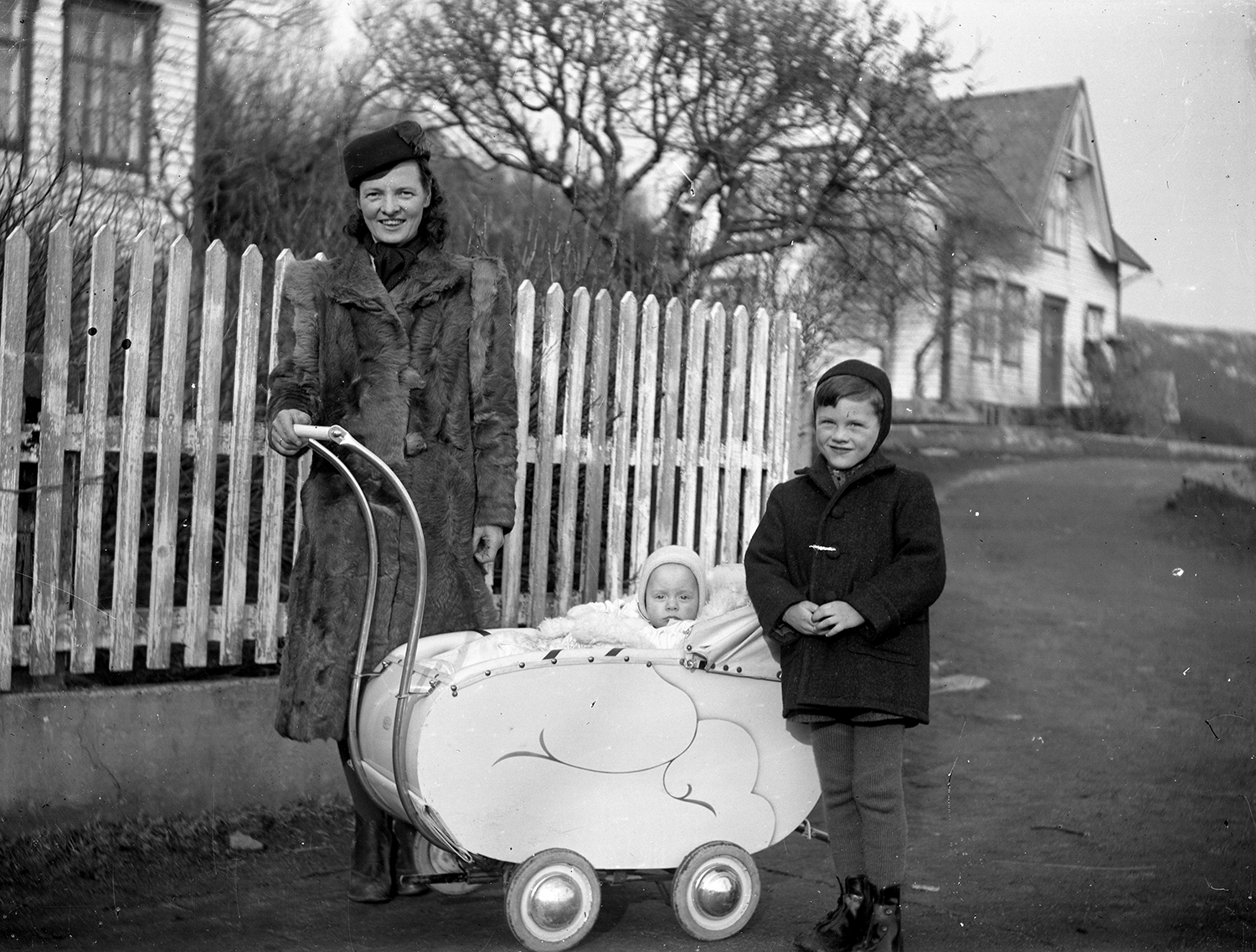 Nanna Eggesbø ute på trilletur i mars 1945. Inge Johan (1944) sit i vogna og storebror Svein Ove står ved sida av.