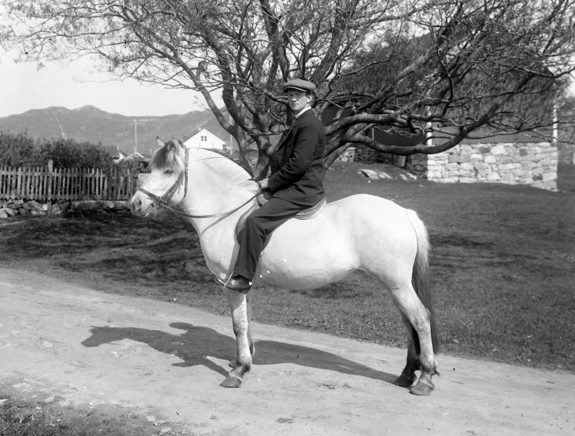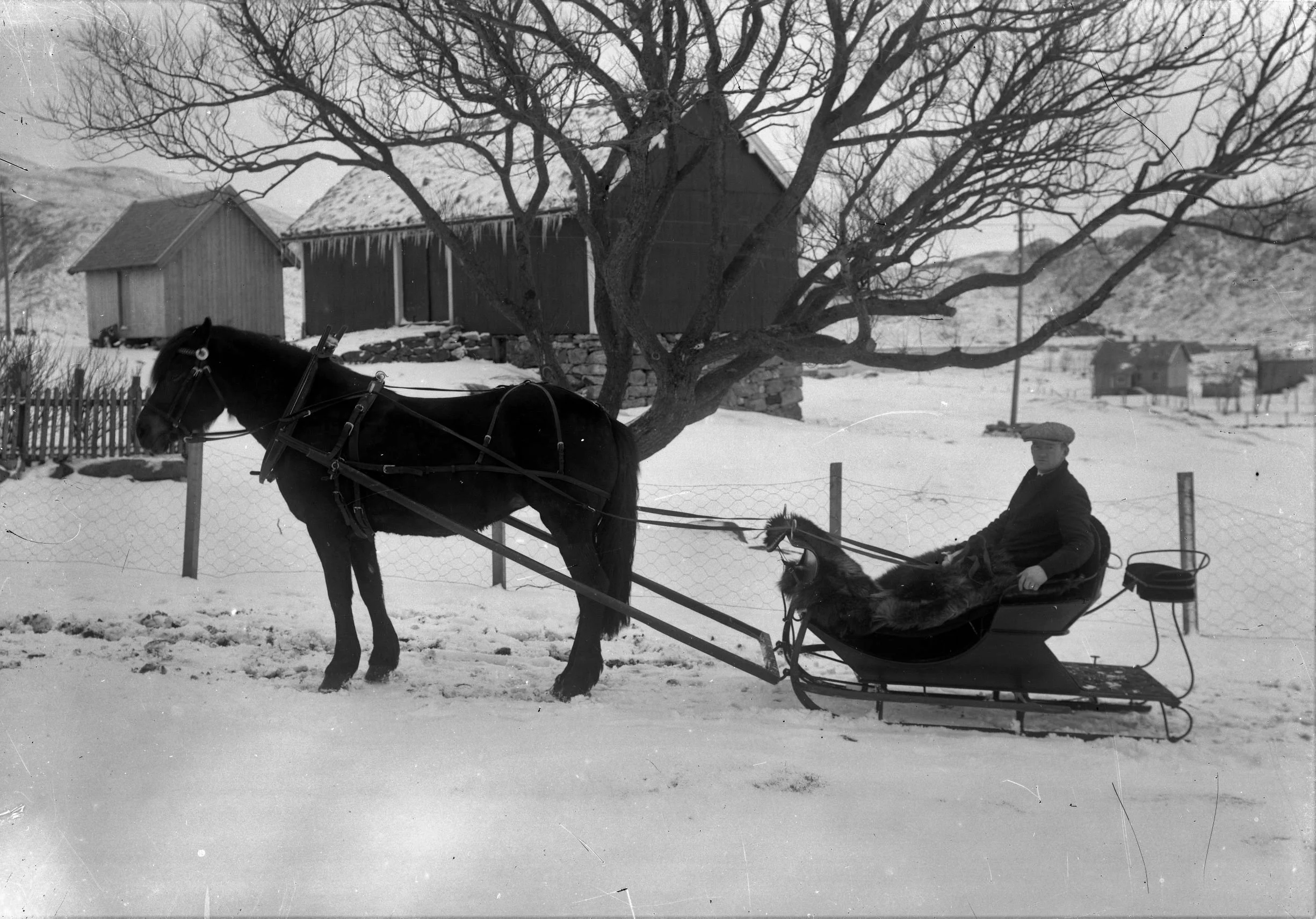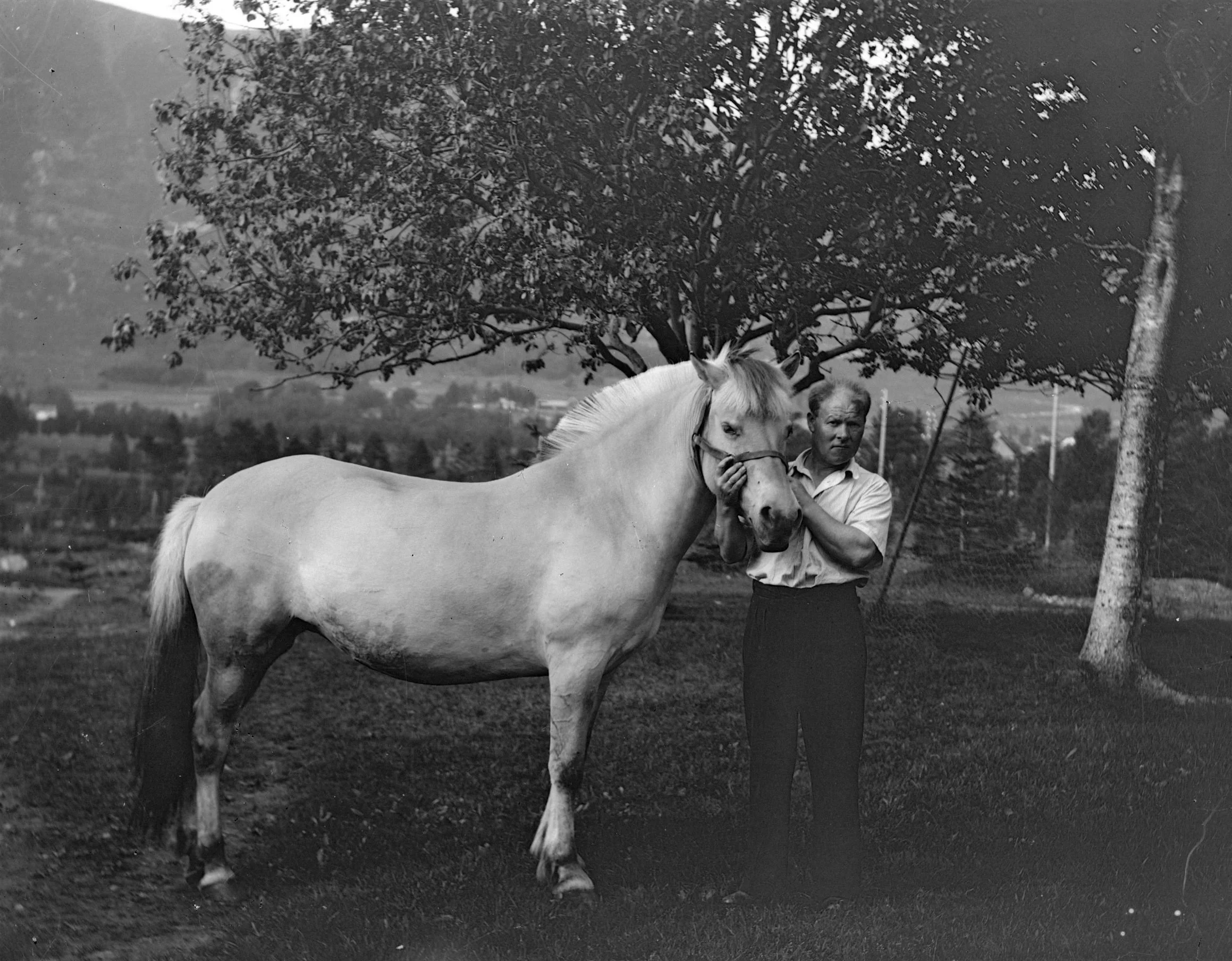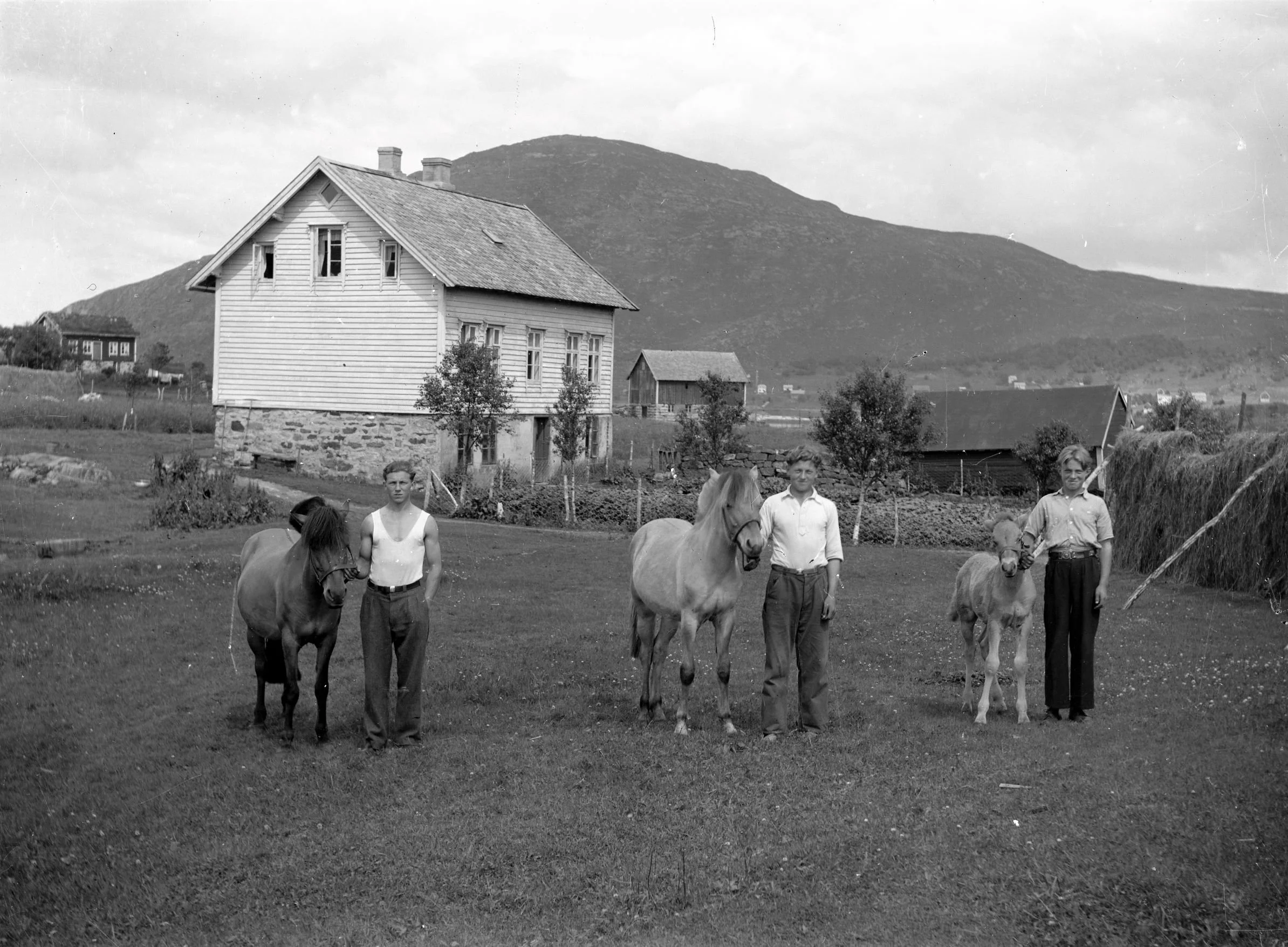 Hestar på Berge Nedre under krigen. Frå venstre står Olav, Paul og Konrad Berge.