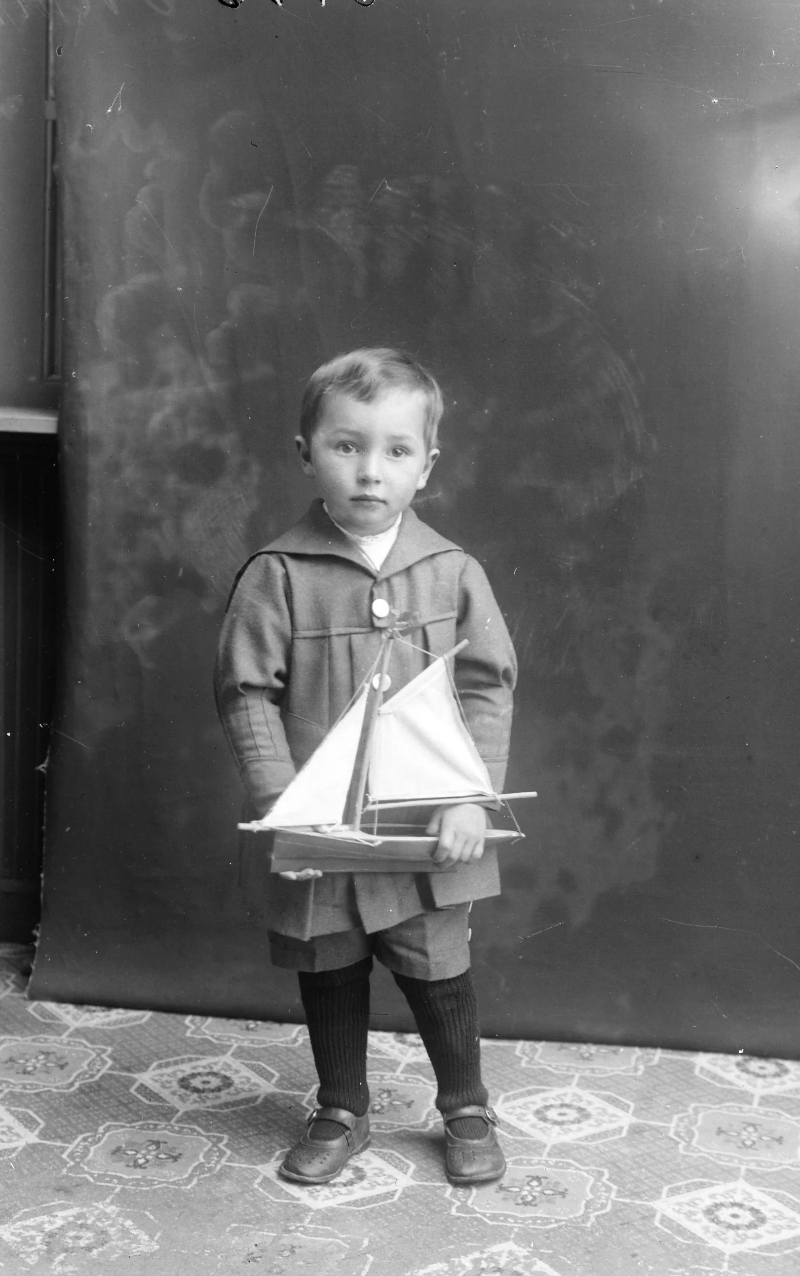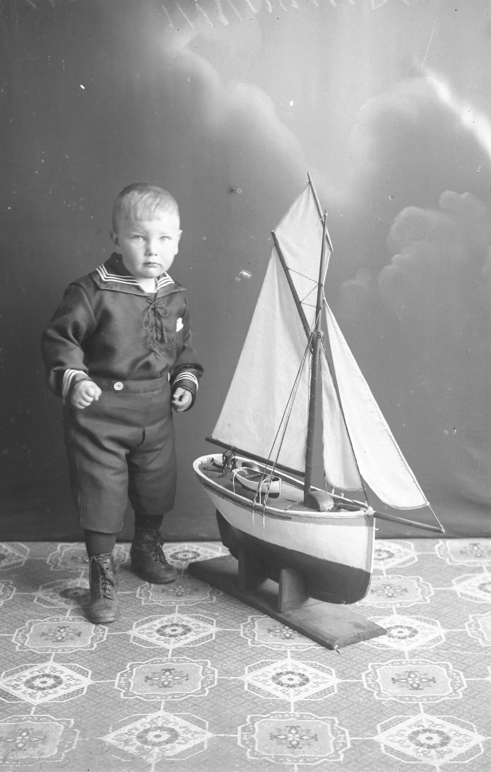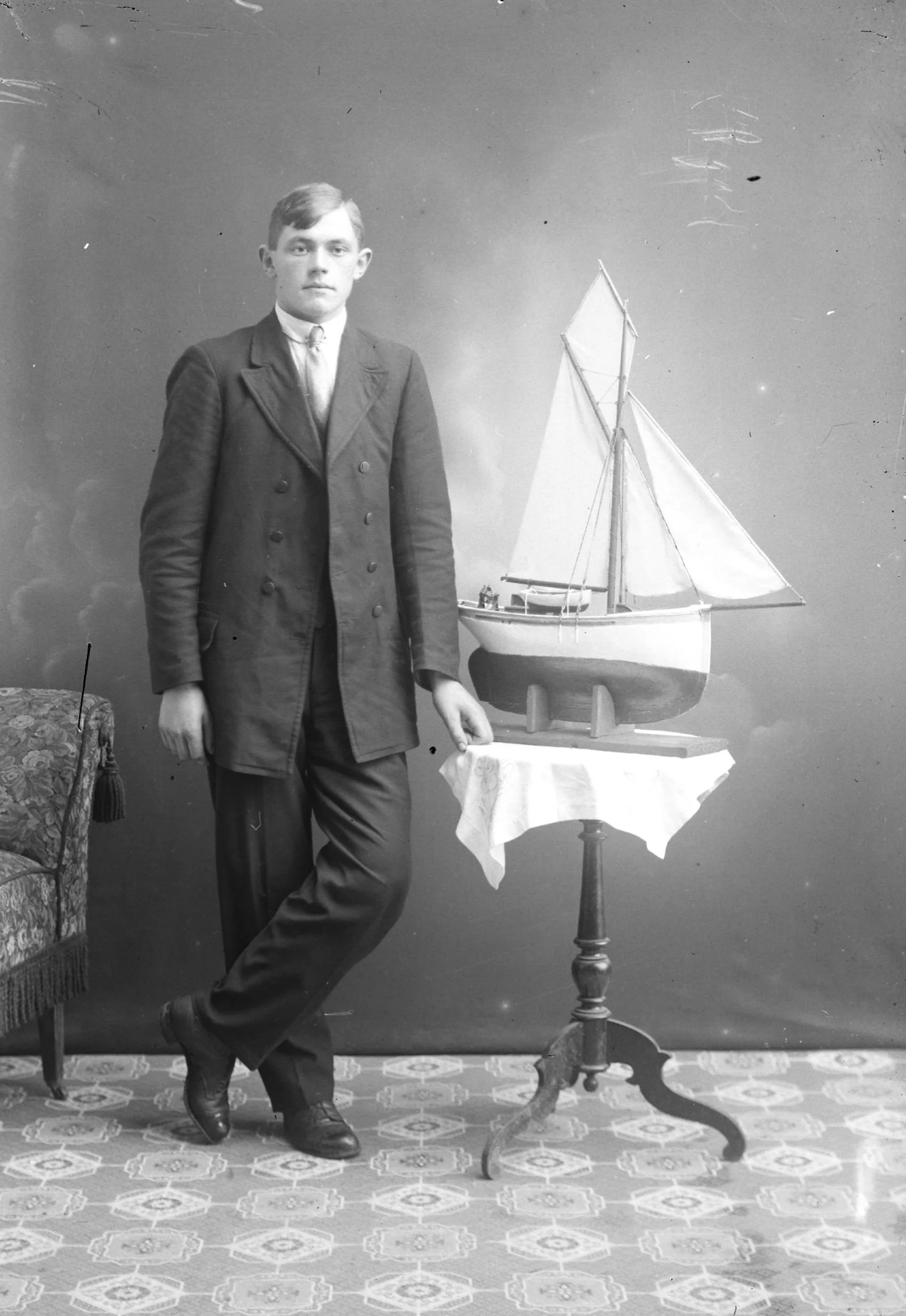 På dette bilete frå mars 1918 står Ole Feie saman med skuta i atelieret. Ole var født i juni 1904 og er 13 år på bilete. I vaksen alder vart han sjømann, og hadde m.a. hyre på båtane til Gustav Evanger.