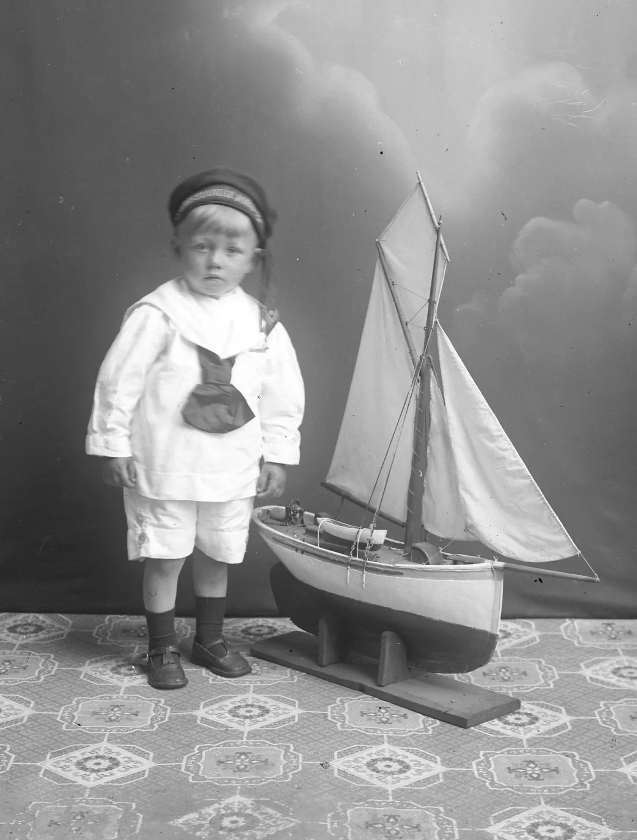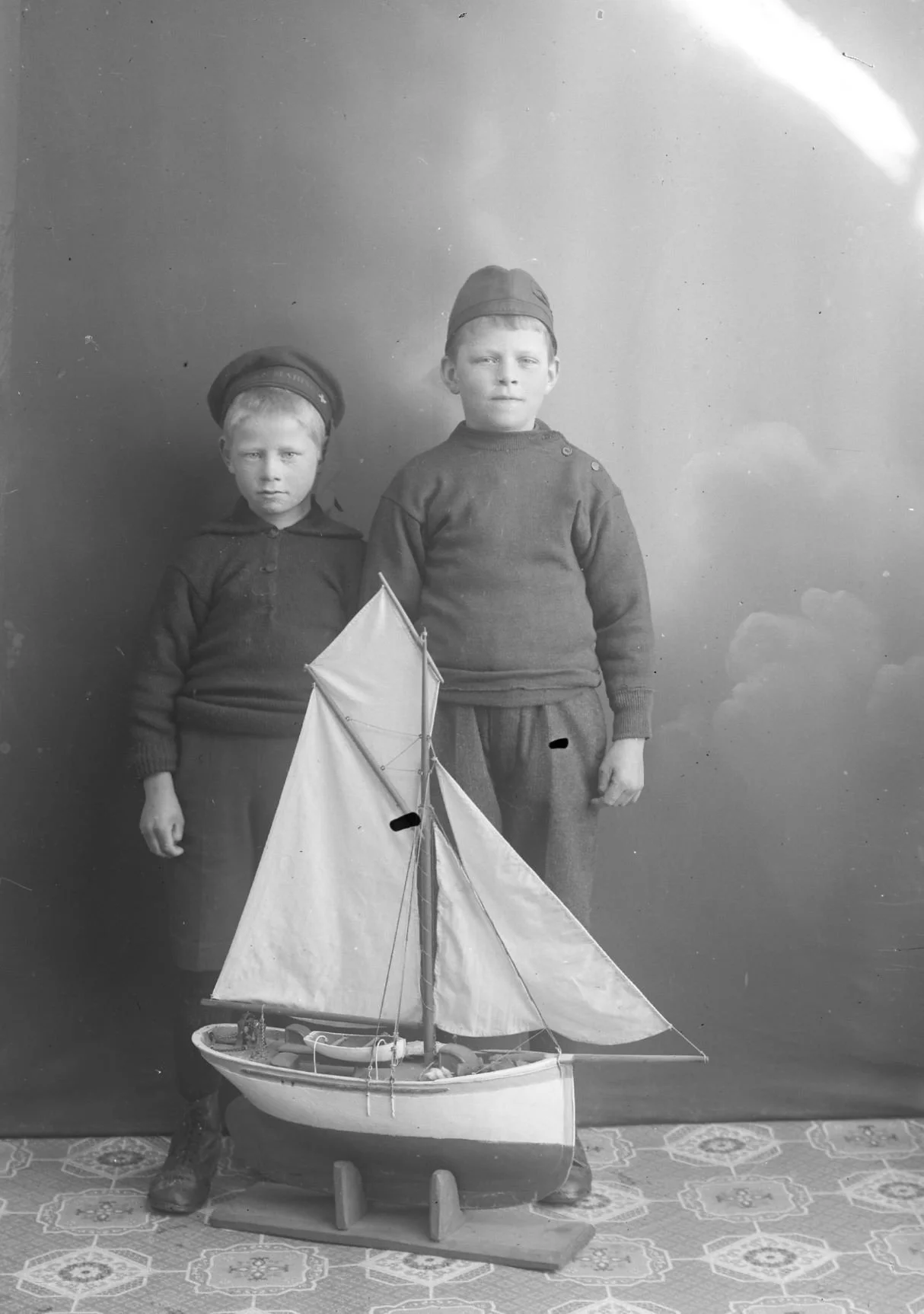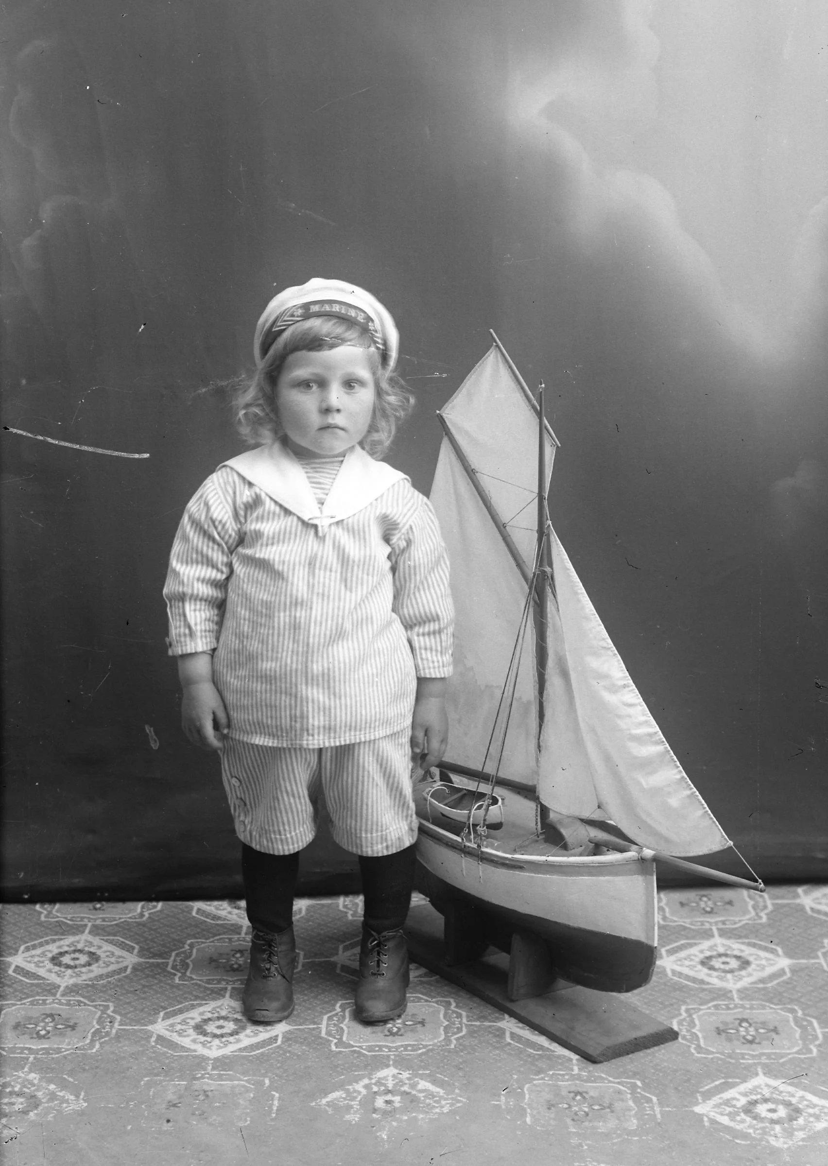 På dette bilete frå mars 1918 står Ole Feie saman med skuta i atelieret. Ole var født i juni 1904 og er 13 år på bilete. I vaksen alder vart han sjømann, og hadde m.a. hyre på båtane til Gustav Evanger.
