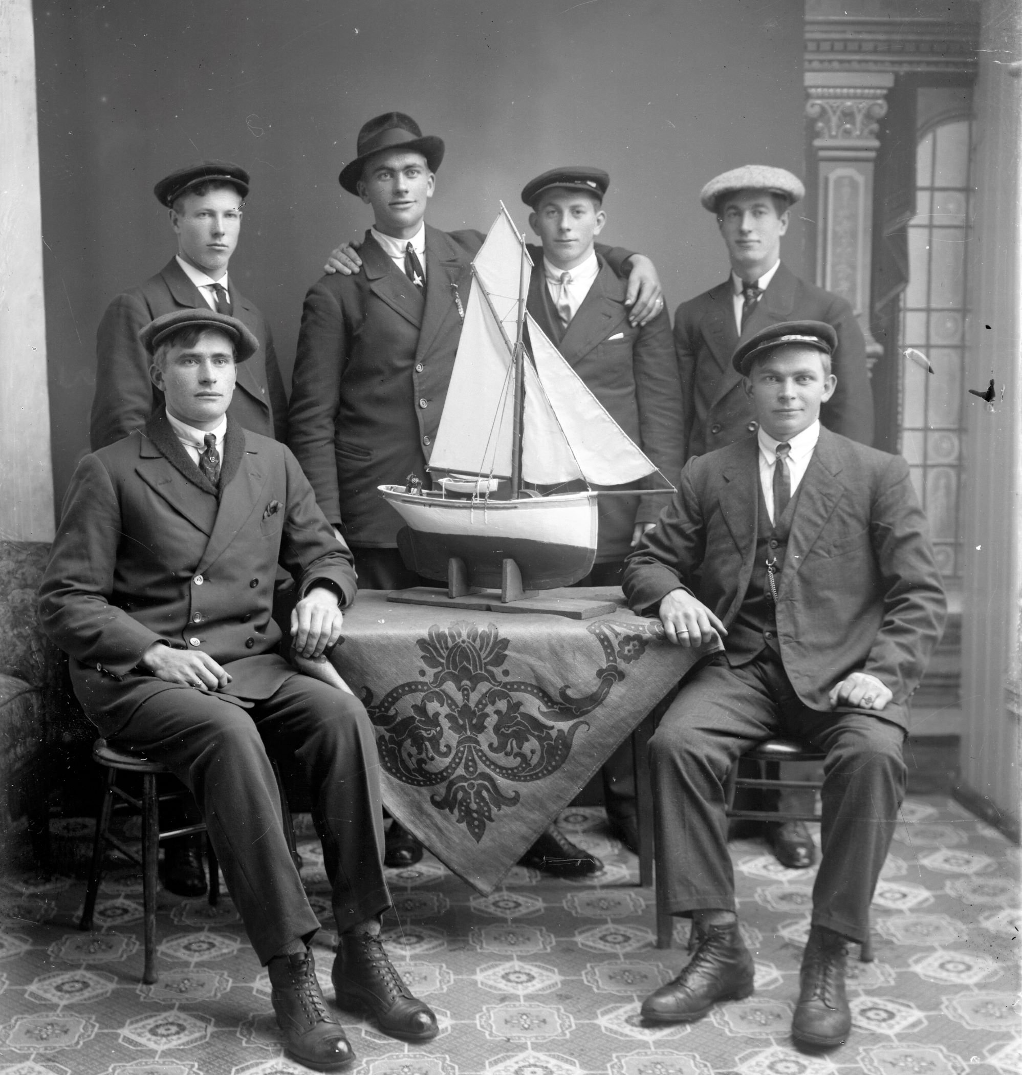 På bilete står bak frå venstre Joakim Vågsholm (1893), Lars Jakobsen Bostad (1895), Nils N. Myklebust (1897) og Jakob Vågsholm (1895). Framme sit frå venstre Johannes Jakobsen Bostad (1892) og Petter Tobiasson Myklebust (1890).
