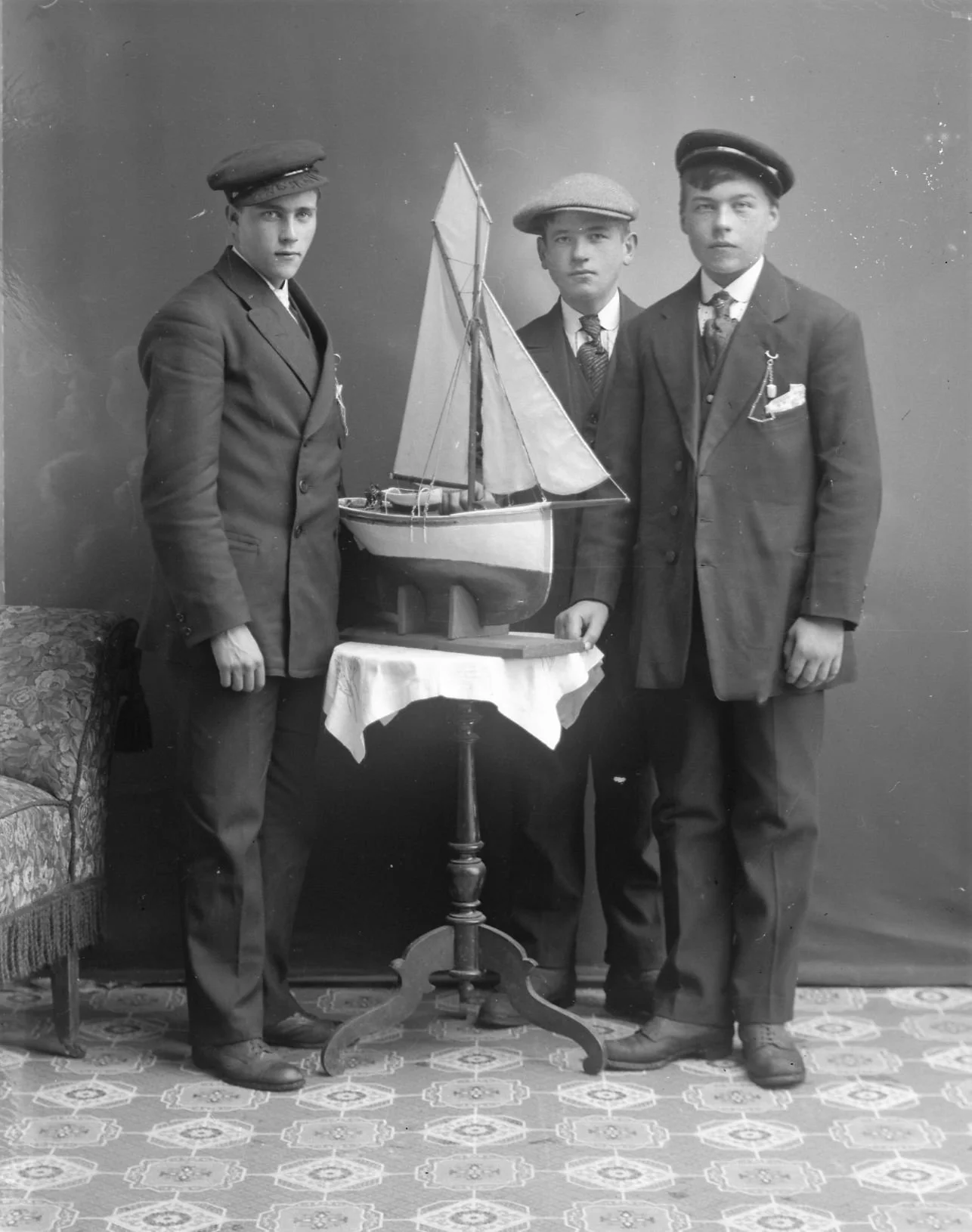 I atelieret til ein fotograf vil det alltid eksistere ei rekkje med ulike bakgrunnar, møblar og rekvisittar som vert nytta i samband med fotograferinga. Slik var det også i atelieret på Berge. Frå om lag 1915 var ein modell av ei seglskute svært populær mellom gutar og mannlege ungdommar. Modellen er så langt ikkje observert på familiebilete eller på bilete med jenter.