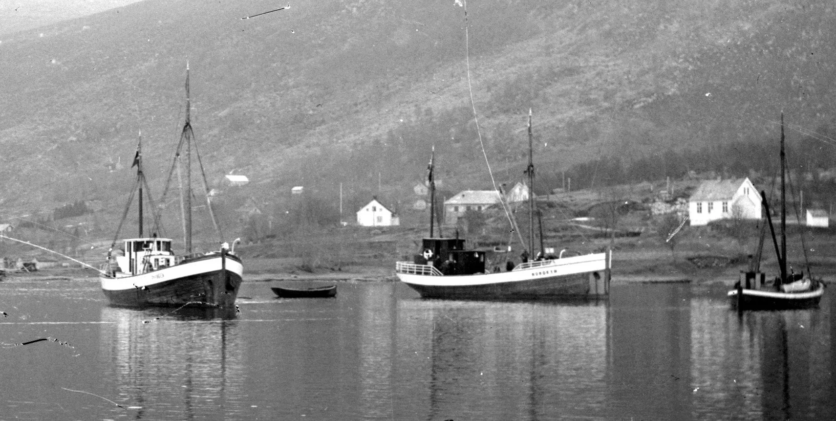 Nordkyn ligg for anker på Klungsøyr hamn i Tjørvåg. Bilete er frå april 1933.