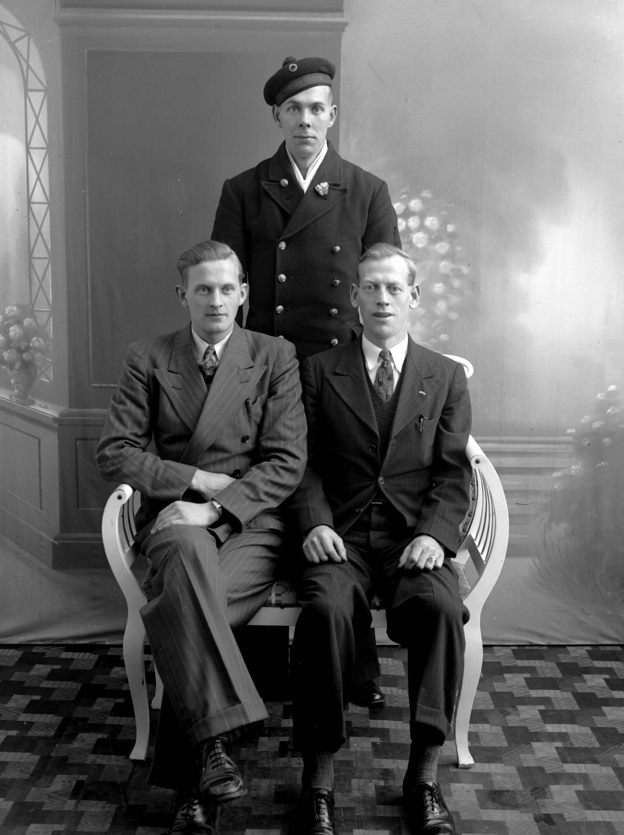 Mindor Myrhol (høgre), Gunnar Myrhol (bak) og Dankert Bostad (venstre) i oktober 1945.