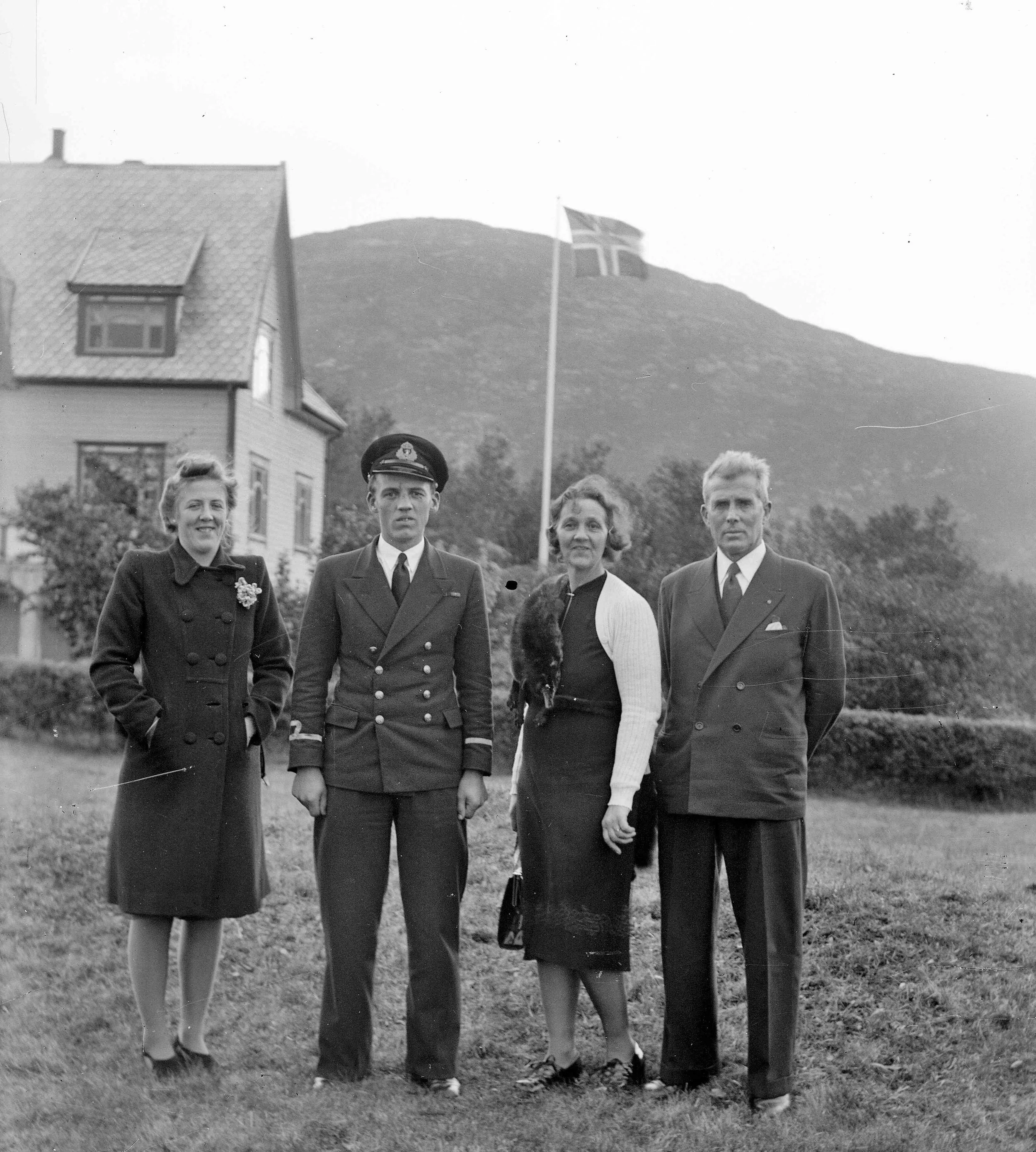 Familien Nærø utanfor huset i Straumen i oktober 1945. Frå venstre står Gerd Inger, August, Ingeborg og Axel Nærø. Axel Nærø seilte ute under begge verdskrigane og overlevde 2 torpederingar under 1. verdskrig. Frå 1939 til 1941 var han kaptein på “Hada Country” og resten av krigen på “Ogna”. Begge båtane tilhøyrde rederiet Mowinckel i Bergen.