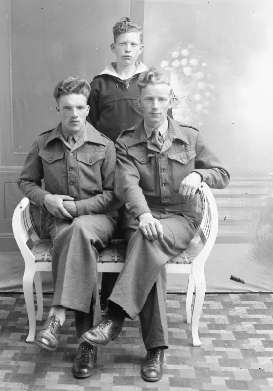 Bilete er frå hausten 1945. Dei tre søskenbarna Bjarne Sørdal (venstre), Jon Igesund (høgre) og Martin Feie (bak).